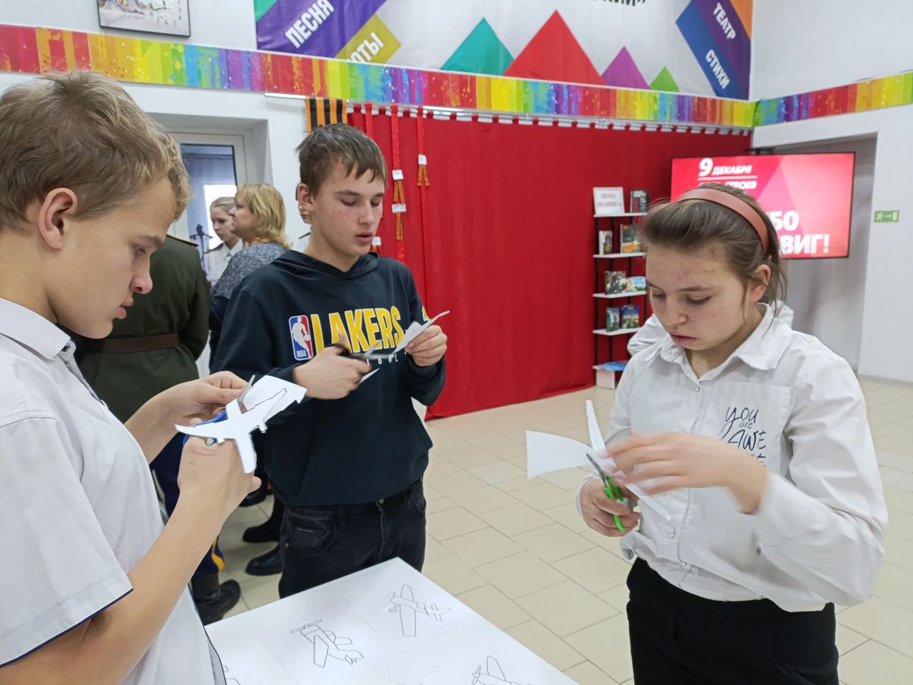 Перед началом кинопоказа в холле учреждения развернулась трогательная акция «Спасибо за подвиг». Учащиеся куйтунских школ, вдумчиво и с большим уважением, писали на специальных карточках имена героев – тех, кому они хотели выразить свою признательность. Это могли быть имена прадедов-фронтовиков, известных военачальников или современников, совершивших отважный поступок, участники СВО. Каждое имя, прикрепленное к общему стенду, стало символом живой памяти и неразрывной связи времен.