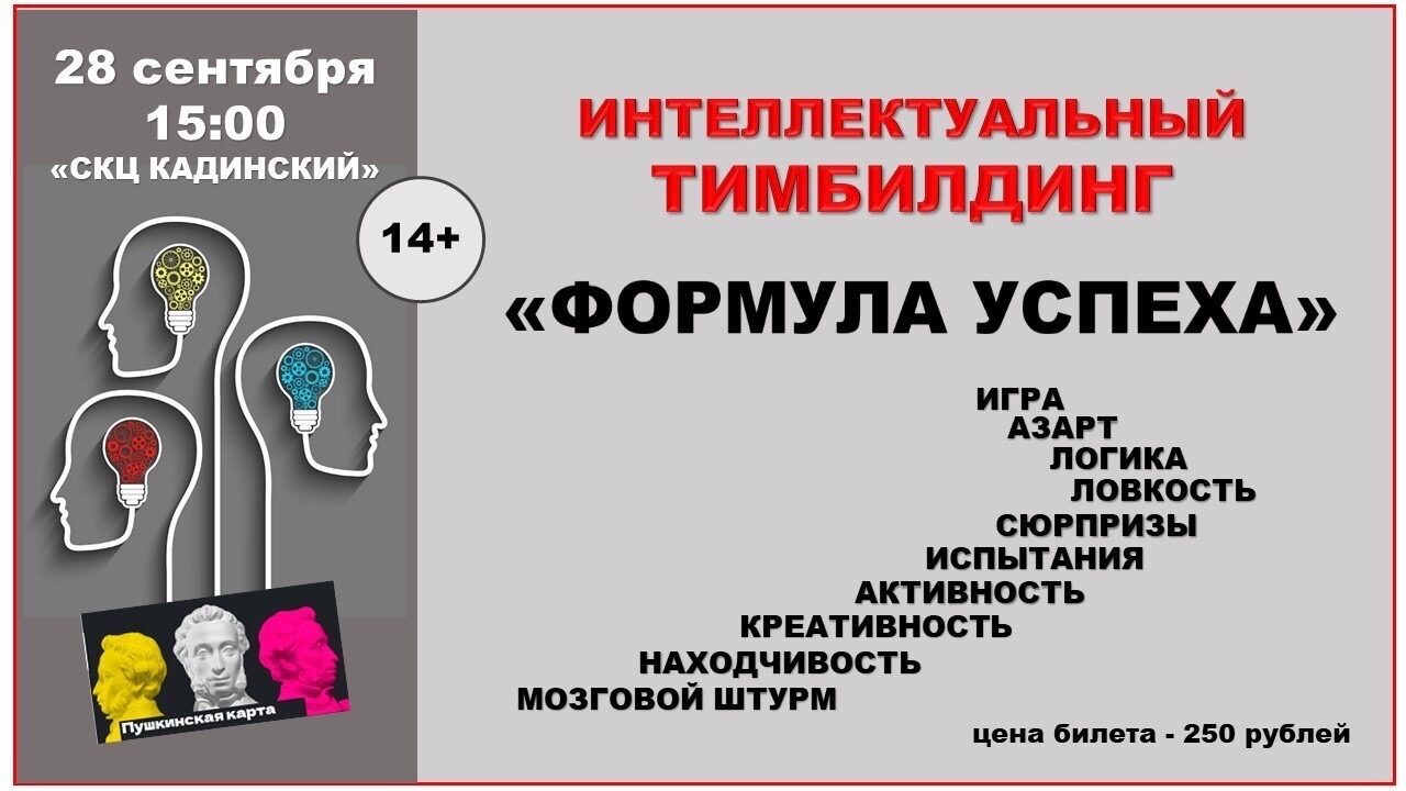Дорогие друзья! «СКЦ Кадинский» приглашает Вас на интеллектуальный тимбилдинг «ФОРМУЛА УСПЕХА» 28 сентября в 15:00.