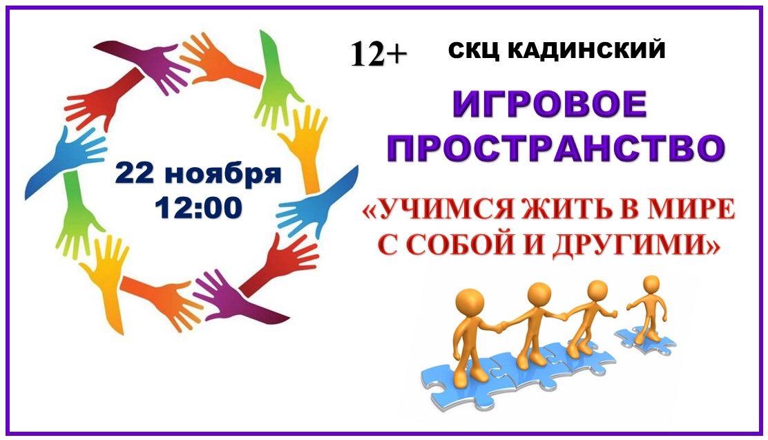 «СКЦ КАДИНСКИЙ» приглашает детей «группы риска», состоящих на учёте в комиссии по делам несовершеннолетних на ИГРОВОЕ ПРОСТРАНСТВО «УЧИМСЯ ЖИТЬ В МИРЕ С СОБОЙ И ДРУГИМИ»