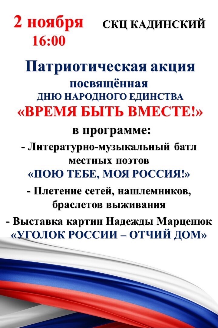 «СОЦИАЛЬНО- КУЛЬТУРНЫЙ ЦЕНТР КАДИНСКИЙ» приглашает всех жителей Куйтуна принять участие в ПАТРИОТИЧЕСКОЙ АКЦИИ «ВРЕМЯ БЫТЬ ВМЕСТЕ!».