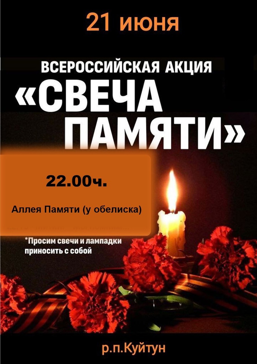 АДМИНИСТРАЦИЯ КУЙТУНСКОГО ГОРОДСКОГО ПОСЕЛЕНИЯ И "СОЦИАЛЬНО-КУЛЬТУРНЫЙ ЦЕНТР КАДИНСКИЙ" ПРИГЛАШАЮТ ВСЕ УЧРЕЖДЕНИЯ И ЖИТЕЛЕЙ р.п.КУЙТУН ПРИСОЕДИНИТЬСЯ К АКЦИИ "СВЕЧА ПАМЯТИ"