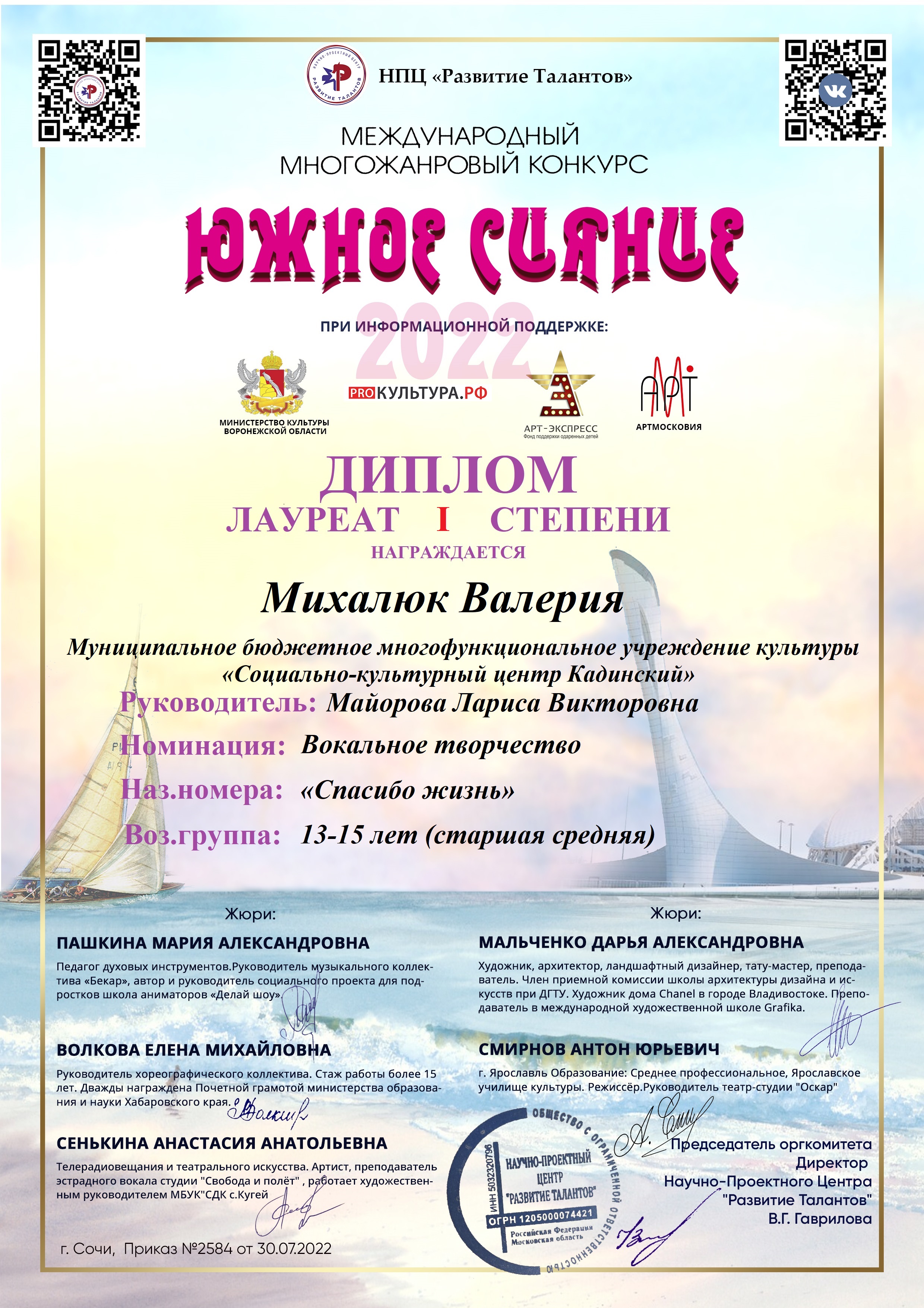 - МИХАЛЮК ВАЛЕРИЯ (руководитель Заслуженный работник культуры РФ Майорова Л.В) - Лауреат 1 степени