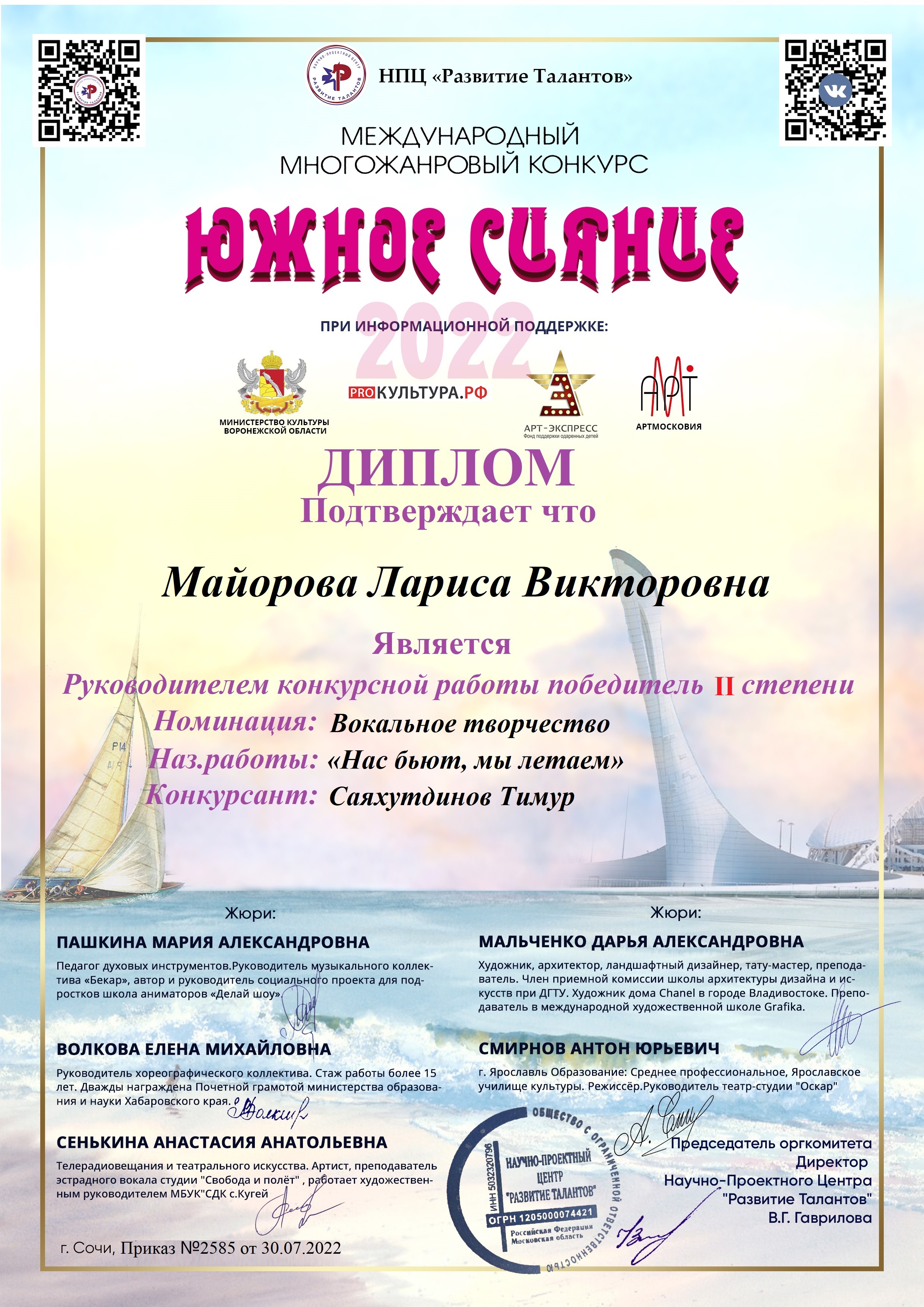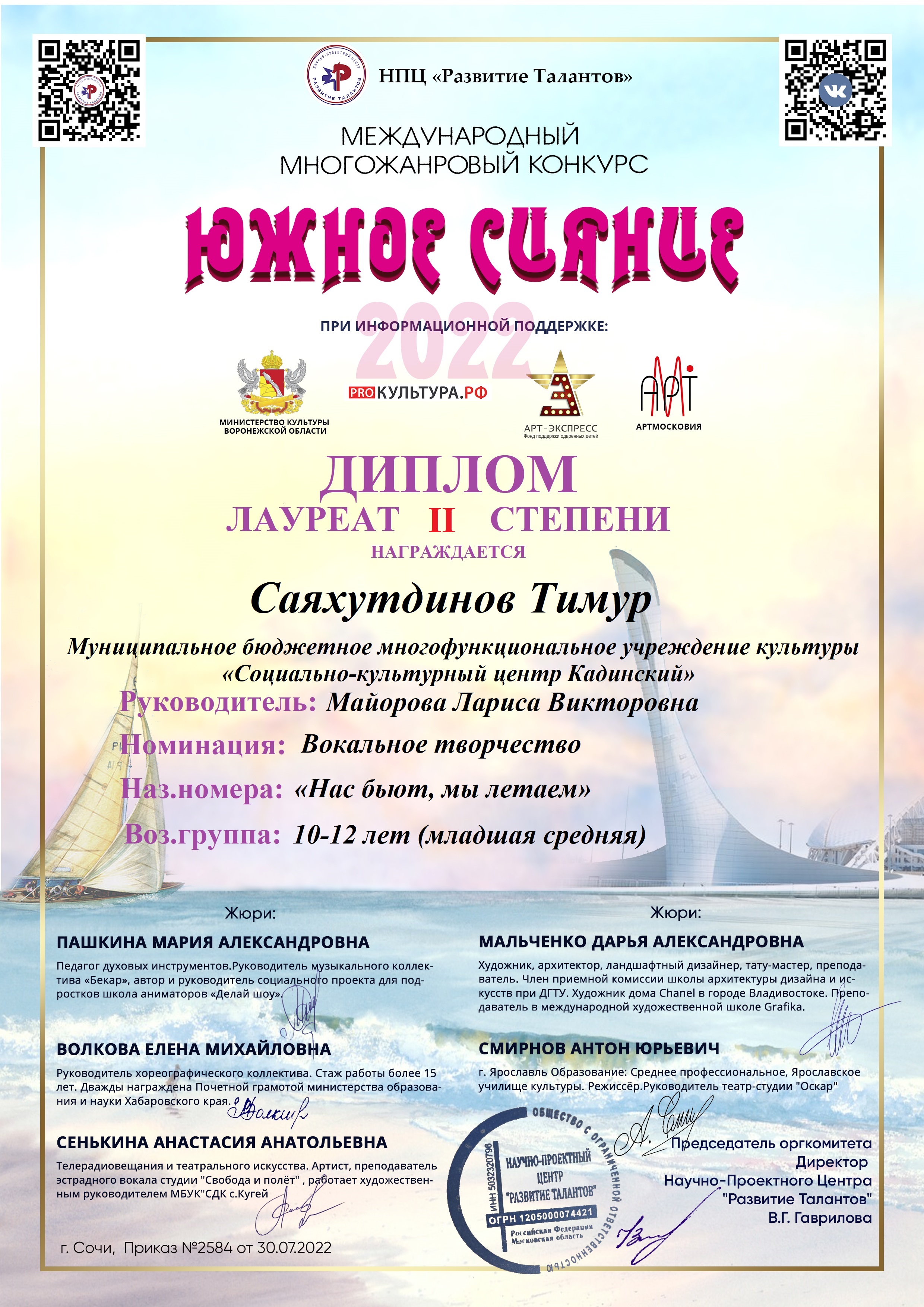 - САЯХУТДИНОВ ТИМУР (руководитель Заслуженный работник культуры РФ Майорова Л.В) - Лауреат 2 степени