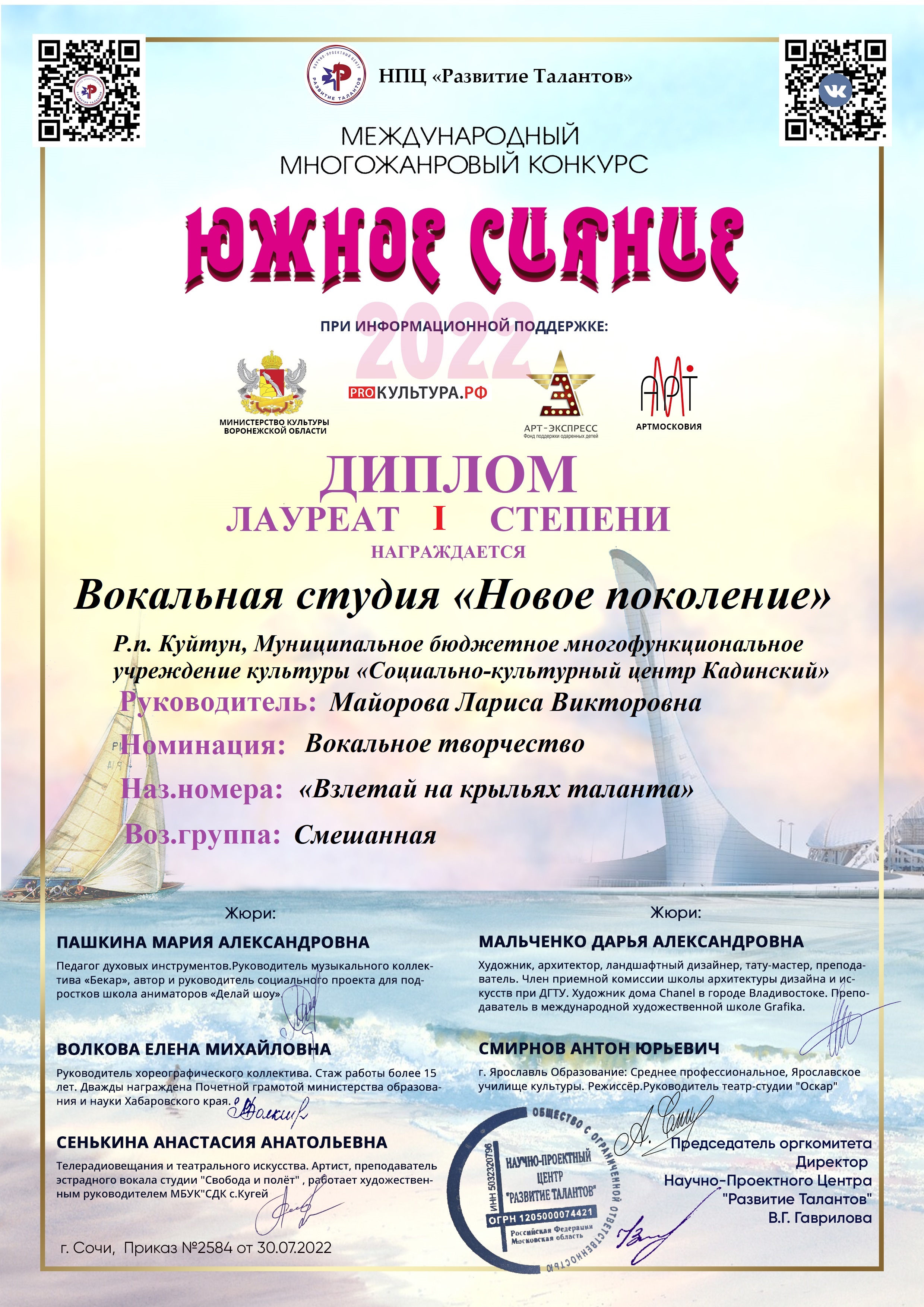 Участники творческих коллективов "СКЦ Кадинский" приняли участие в Международном Многожанровом конкурсе искусств "Южное Сияние-2022".