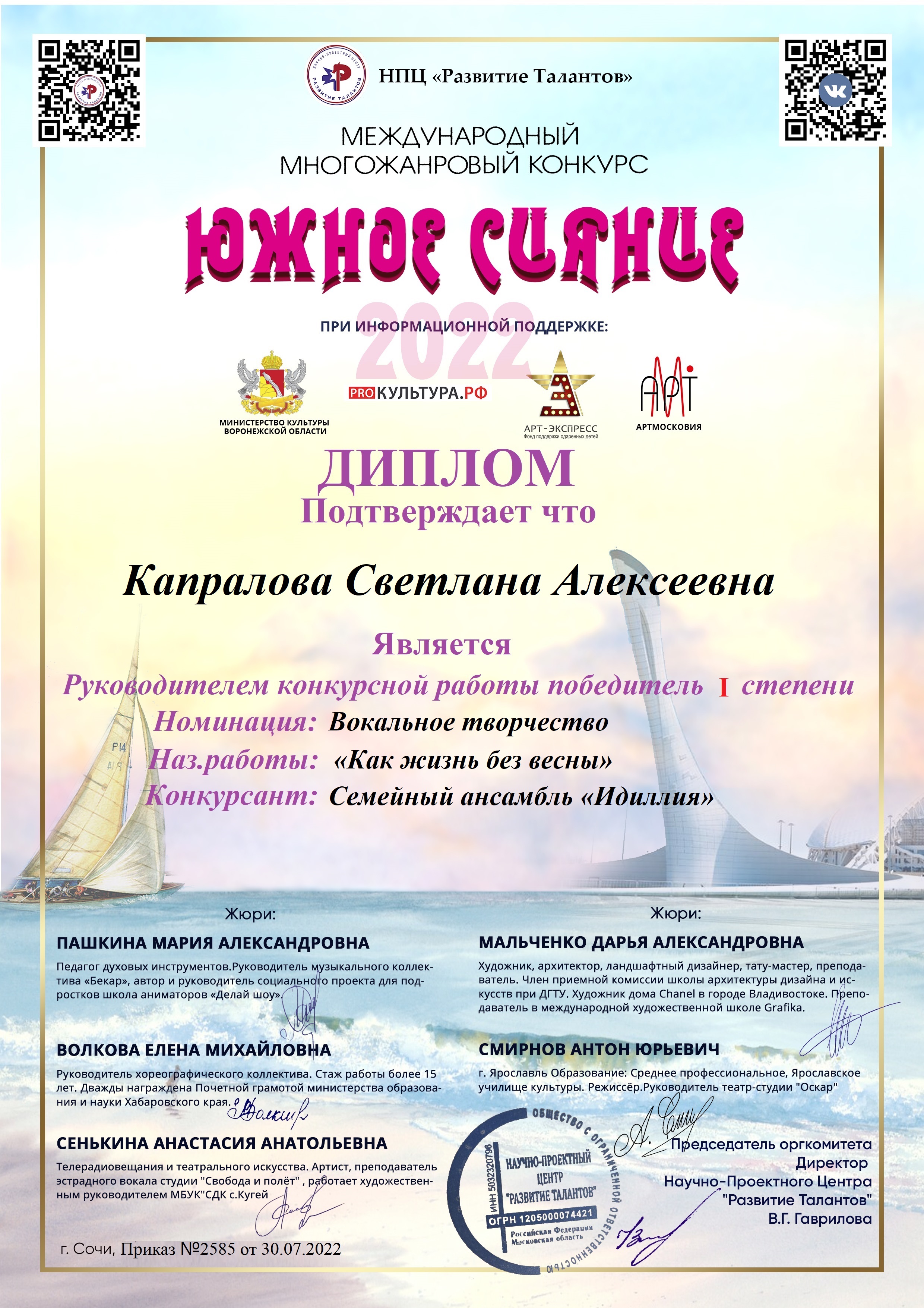 - СЕМЕЙНЫЙ АНСАМБЛЬ "ИДИЛЛИЯ" (руководитель Капралова С.А). - Лауреат 1 степени