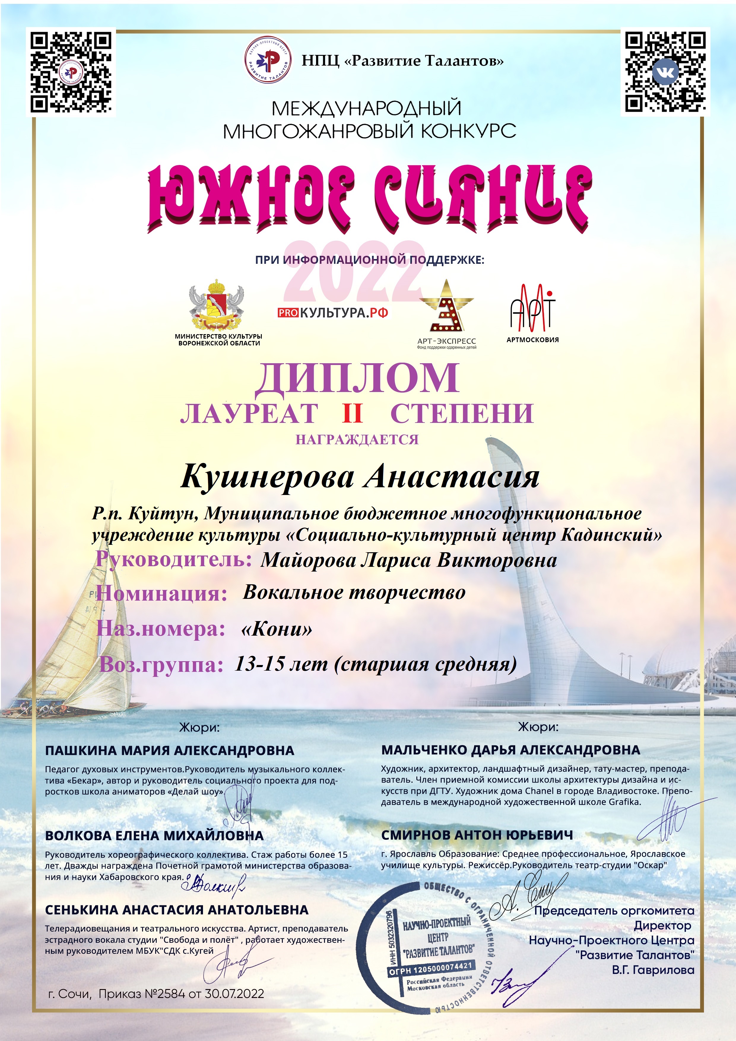 - КУШНЕРОВА АНАСТАСИЯ (руководитель Заслуженный работник культуры РФ Майорова Л.В) - Лауреат 2 степени