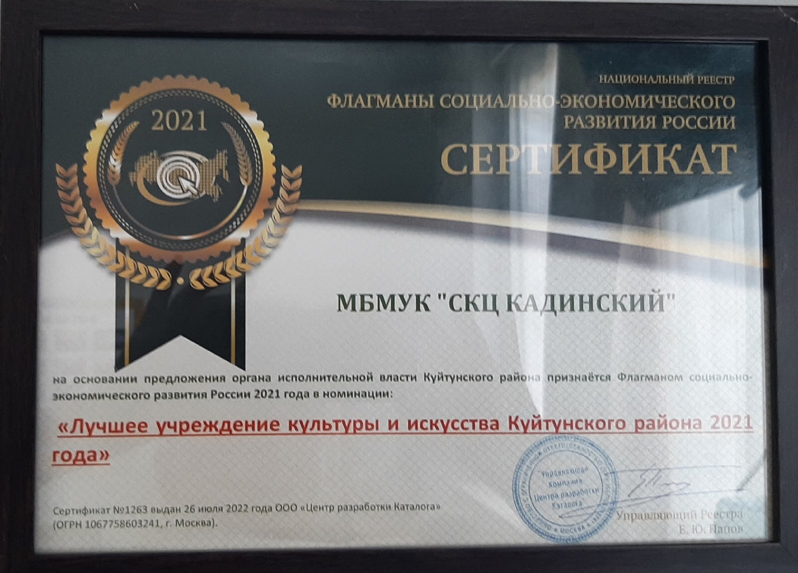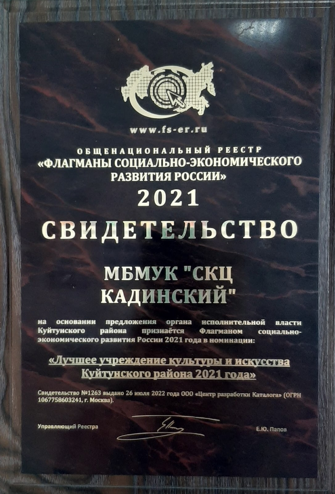 Общенациональный реестр "Флагманы социально-экономического развития России" 2021 СВИДЕТЕЛЬСТВО МБМУК "СКЦ КАДИНСКИЙ" на основании предложения органа исполнительной власти Куйтунского района признан Флагманом социально-экономического развития России 2021 года в номинации: "Лучшее учреждение культуры и искусства Куйтунского района 2021 года".