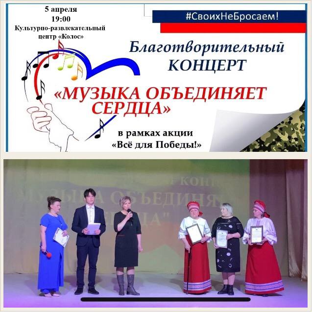 5 апреля в Культурно-развлекательном центре "Колос" состоялся Благотворительный концерт «Музыка объединяет сердца!» в поддержку наших земляков, участвующих в Специальной военной операции.