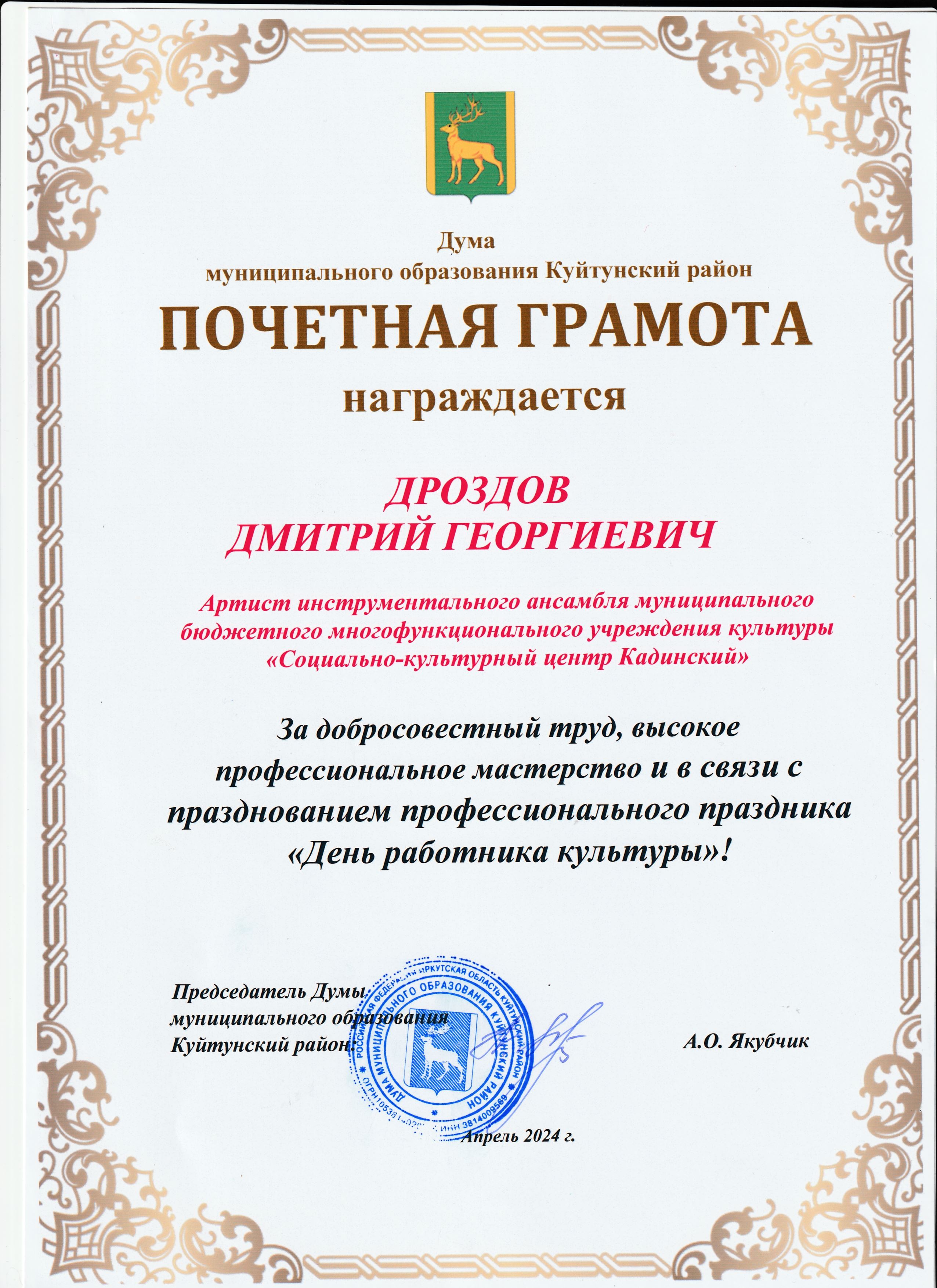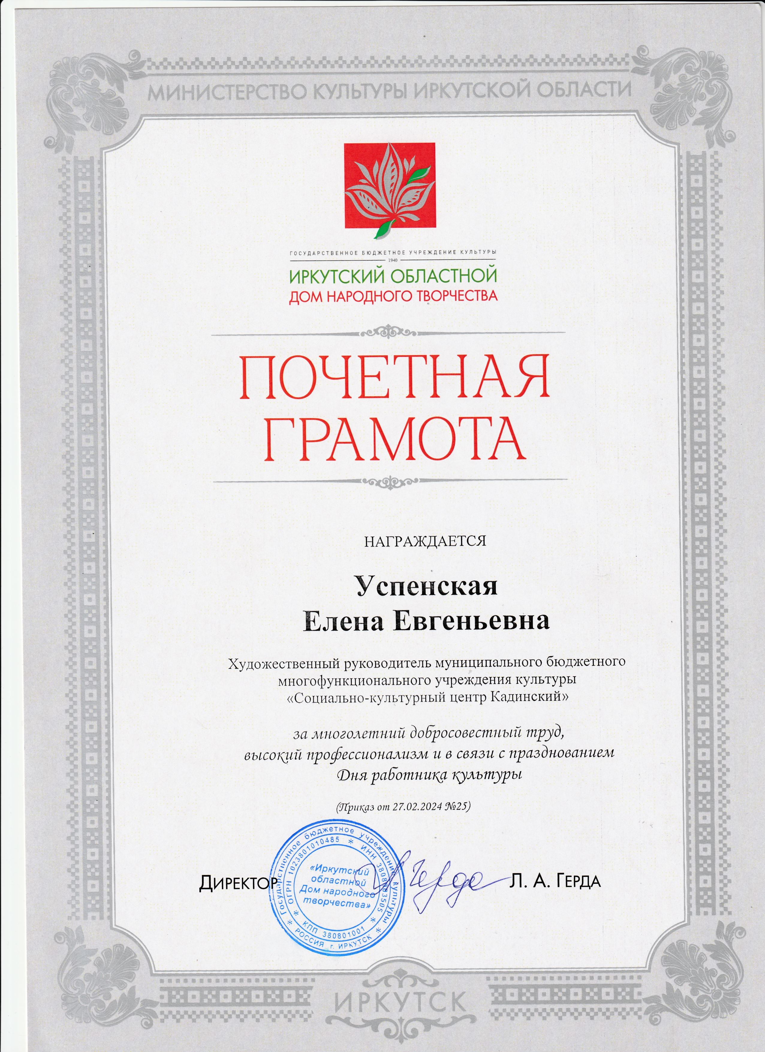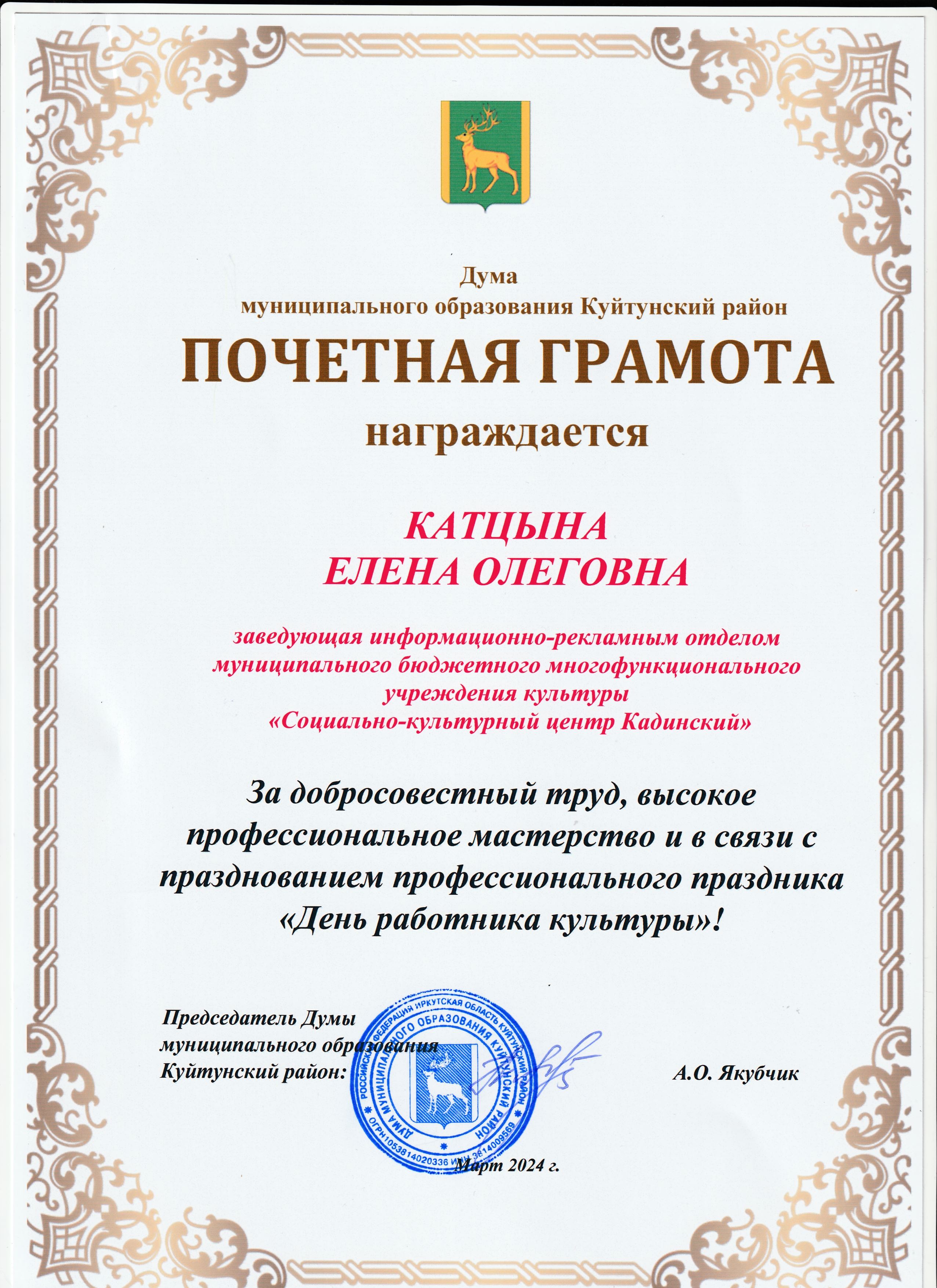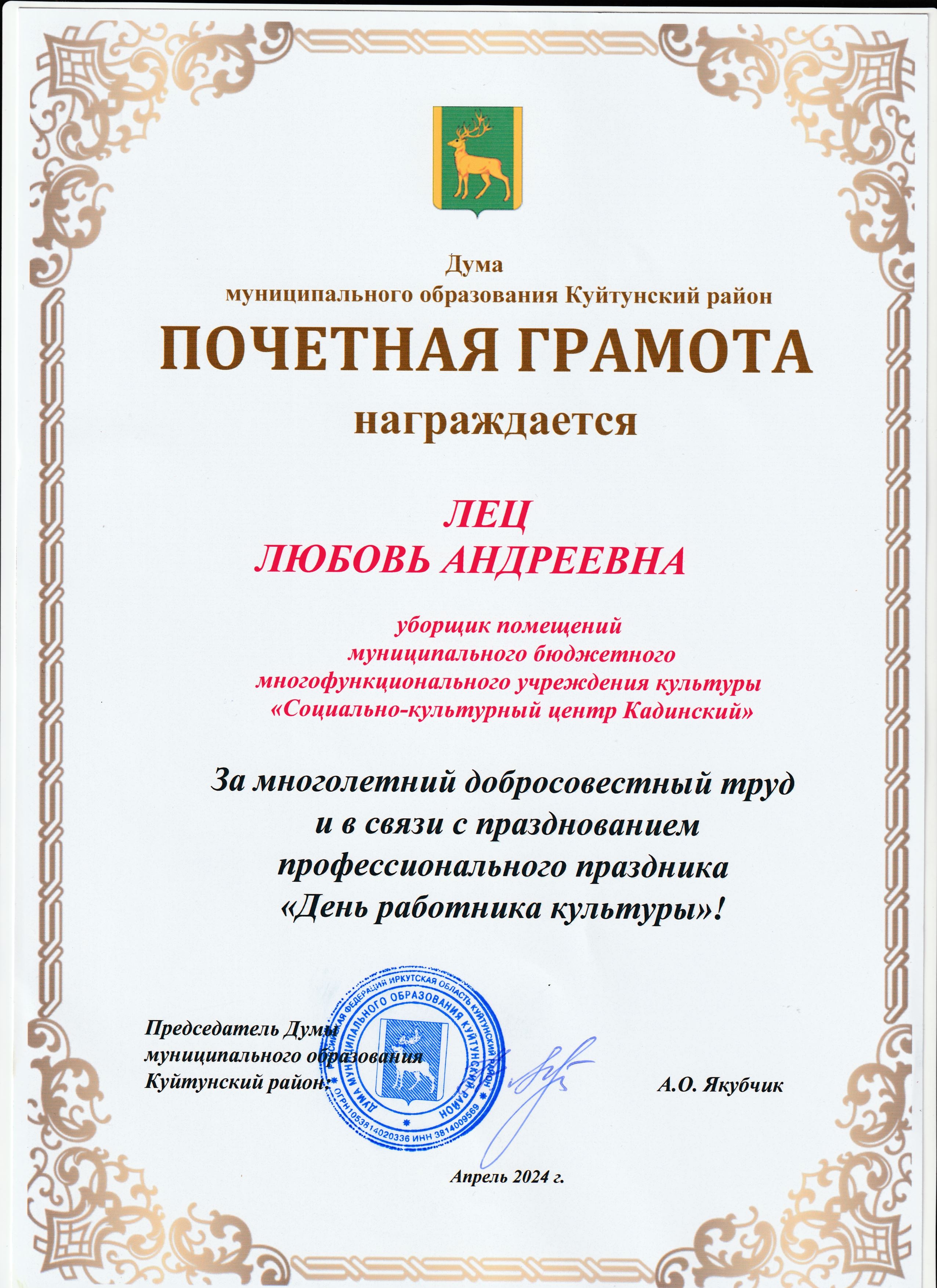 Награждение работников "Социально-культурного центра Кадинский" в связи с празднованием Дня работника культуры.