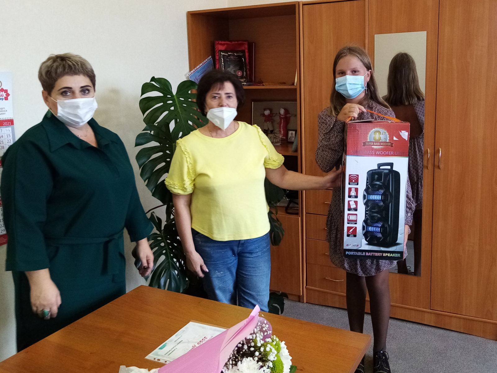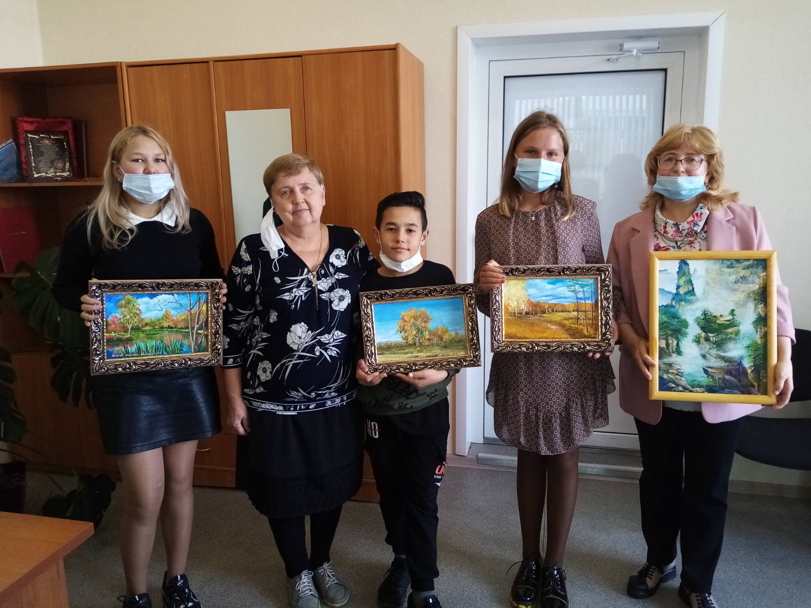 Радостные минуты продолжались - бабушка Тимура Саяхутдинова, Надежда Германовна Марценюк, от чистого сердца вручила Валерии, Анастасии и Тимуру свои авторские картины. Она также поблагодарила руководителя Ларису Викторовну Майорову за подготовку детей, вручив ей прекрасный подарок картину, а Людмила Иннокентьевна вручила благодарность и цветы руководителю.