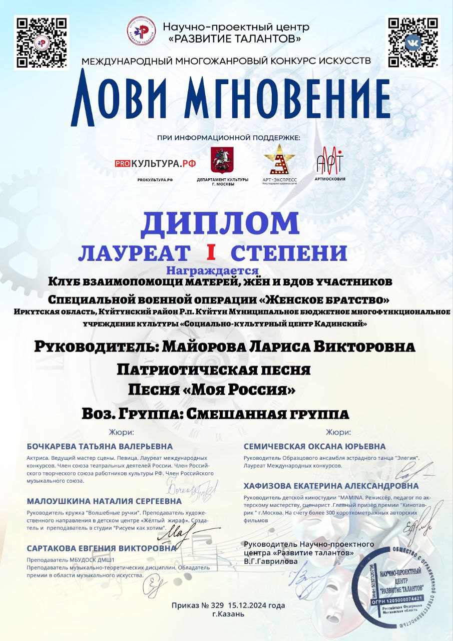 Администрация Куйтунского городского поселения поздравляет Клуб жен и матерей участников СВО "ЖЕНСКОЕ БРАТСТВО" (руководитель Л. В. Майорова МБМУК «СКЦ Кадинский») с победой в Международном многожанровом конкурсе искусств «ЛОВИ МГНОВЕНИЕ».