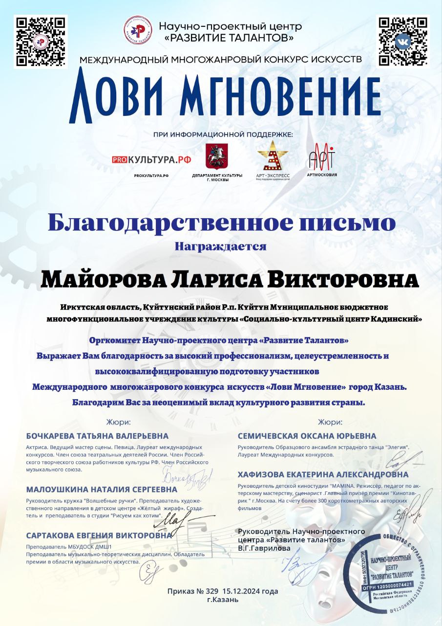 Благодарственным письмом отмечен руководитель МБМУК «СКЦ Кадинский» Майорова Лариса Викторовна за высокий профессионализм, целеустремленность и высококвалифицированную подготовку участников конкурса.