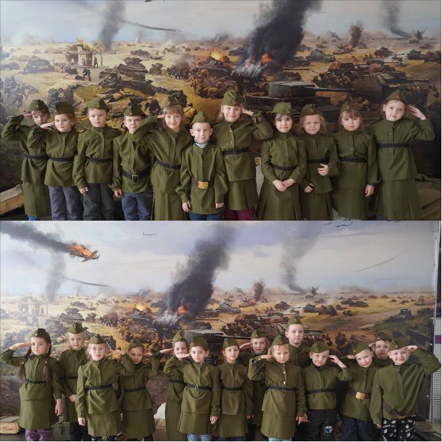 В завершение мероприятия юные зрители примерили на себя роль защитников Родины. Они с удовольствием облачились в военную форму, маршировали, отдавали честь и позировали для памятных фотографий.