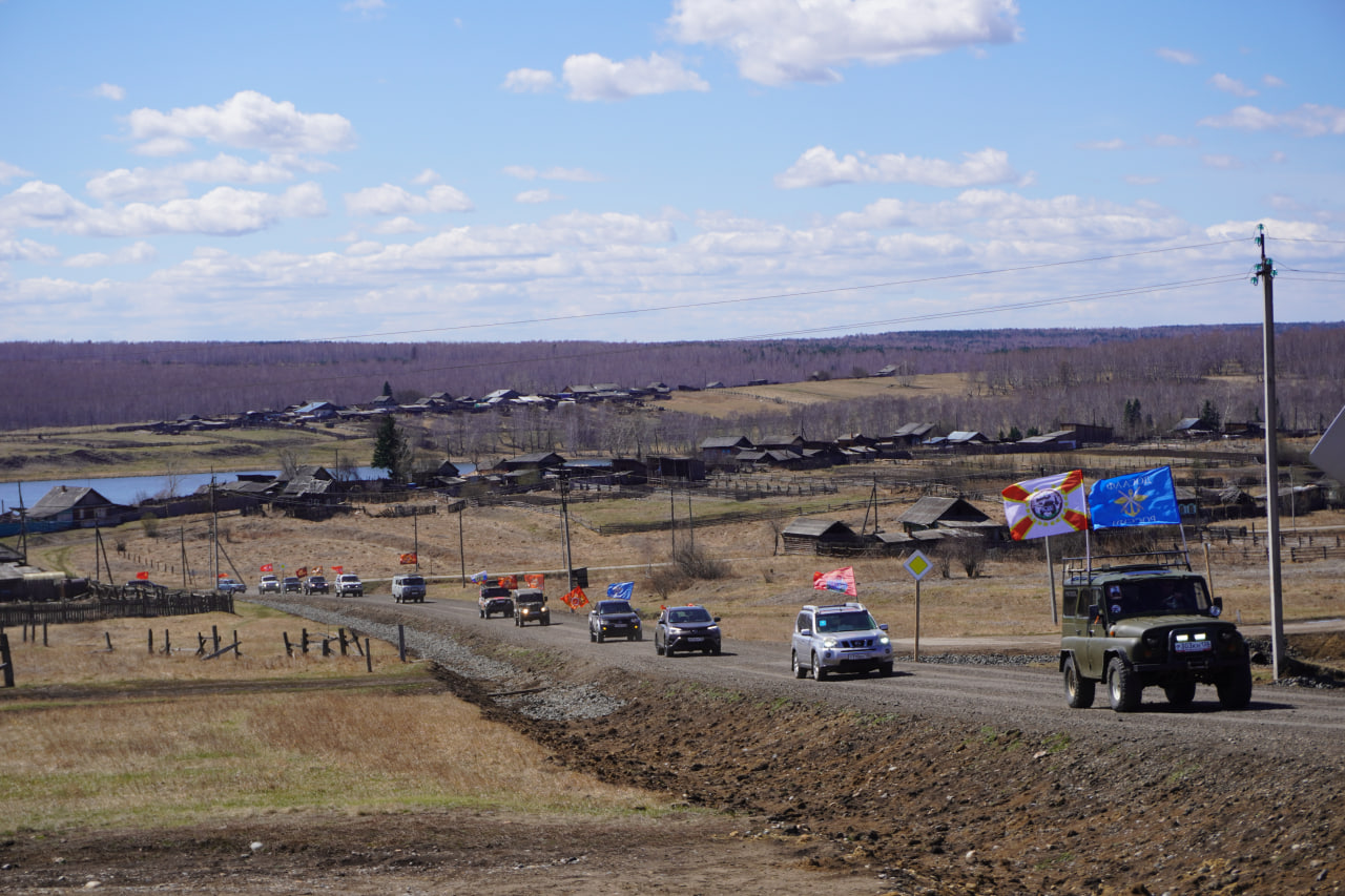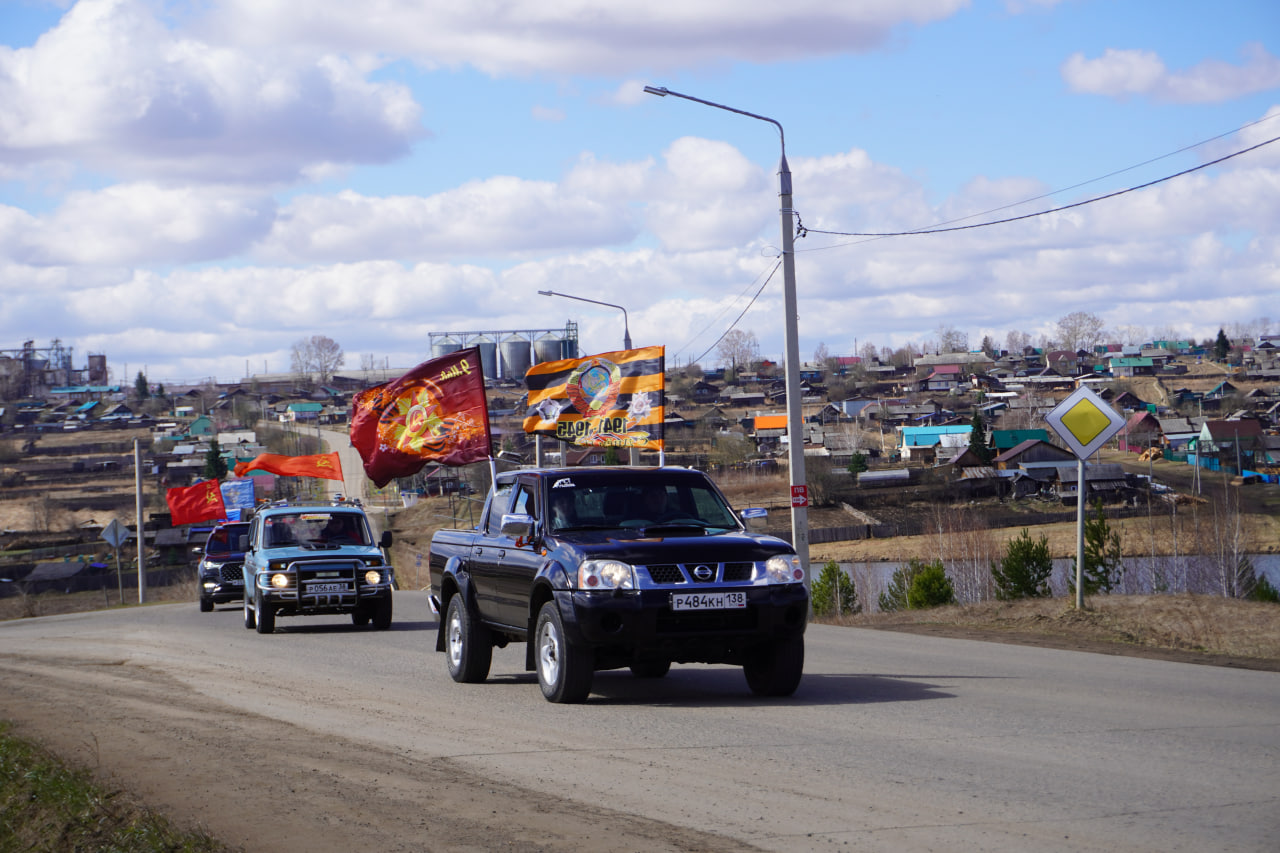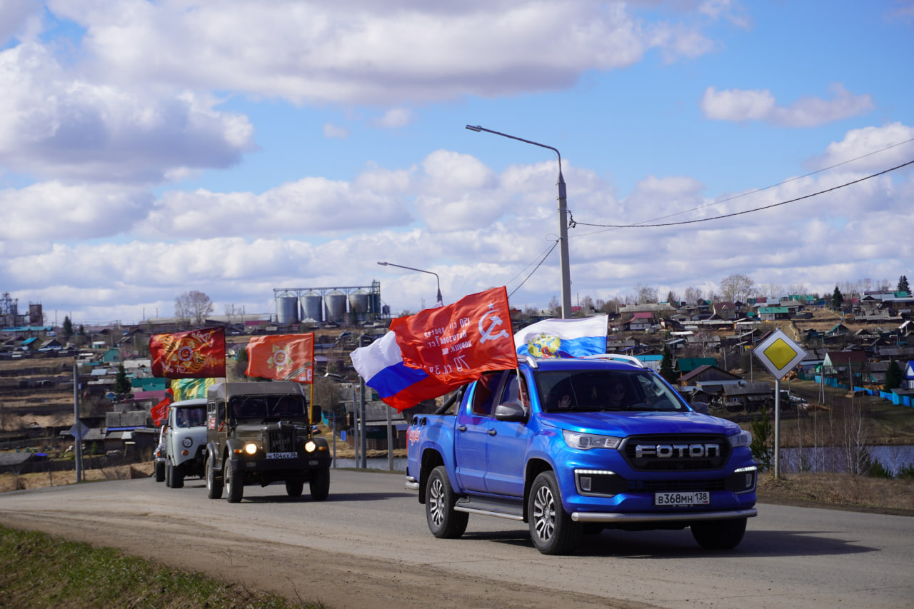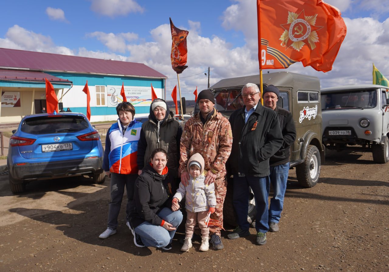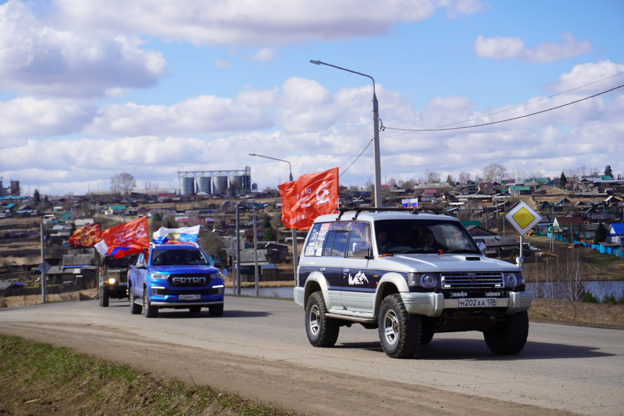 Колонна автомобилей, украшенная флагами и праздничной символикой, с музыкальным сопровождением отправилась в путь от «Социально-культурного центра Кадинский». Первая остановка была сделана в р.п. Куйтун у памятника погибшим землякам, где участники автопробега почтили память героев и возложили цветы.