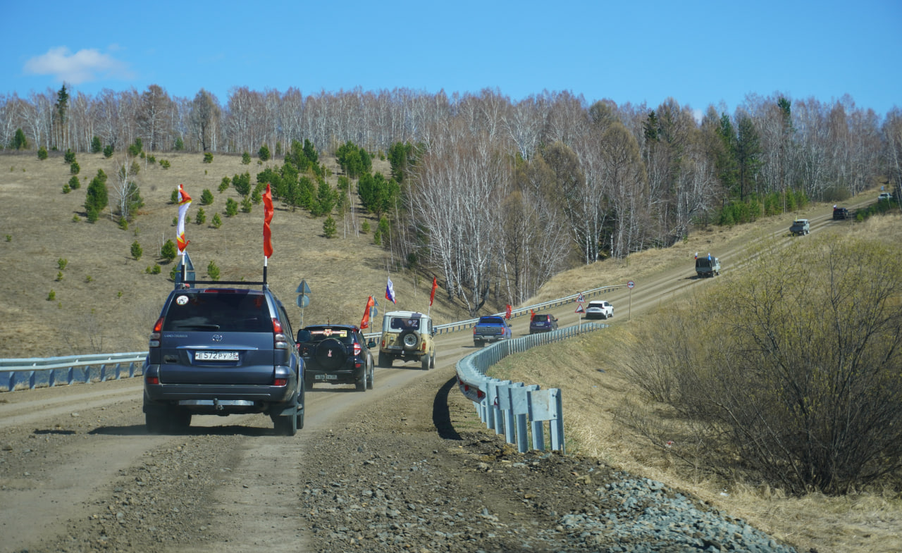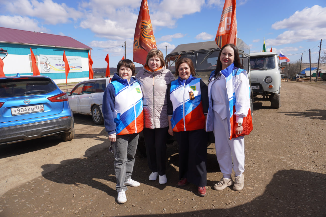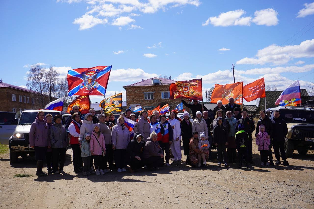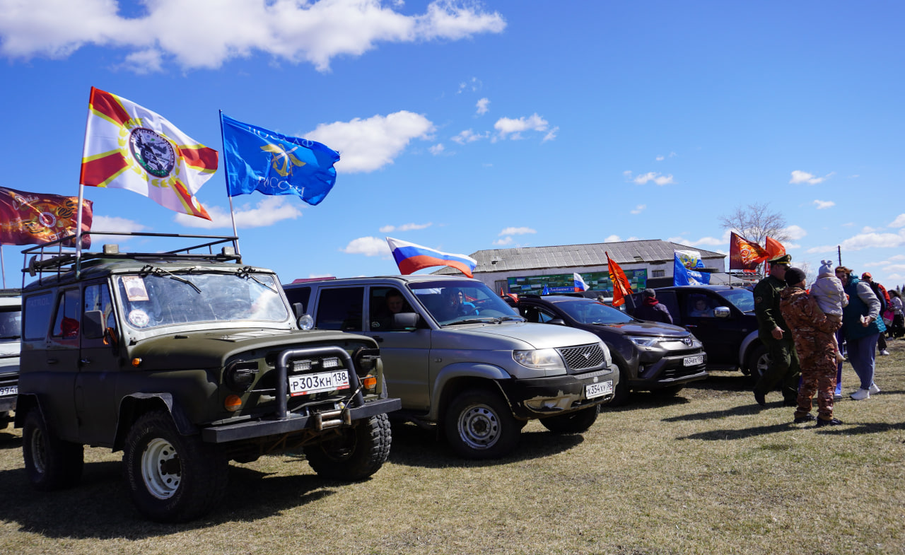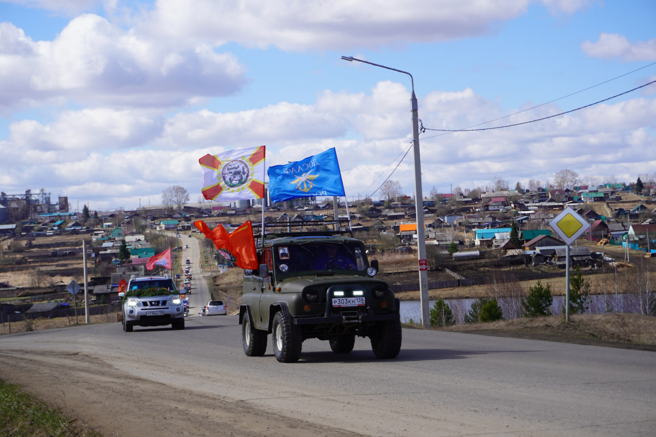 Колонна автомобилей, украшенная флагами и праздничной символикой, с музыкальным сопровождением отправилась в путь от «Социально-культурного центра Кадинский». Первая остановка была сделана в р.п. Куйтун у памятника погибшим землякам, где участники автопробега почтили память героев и возложили цветы.