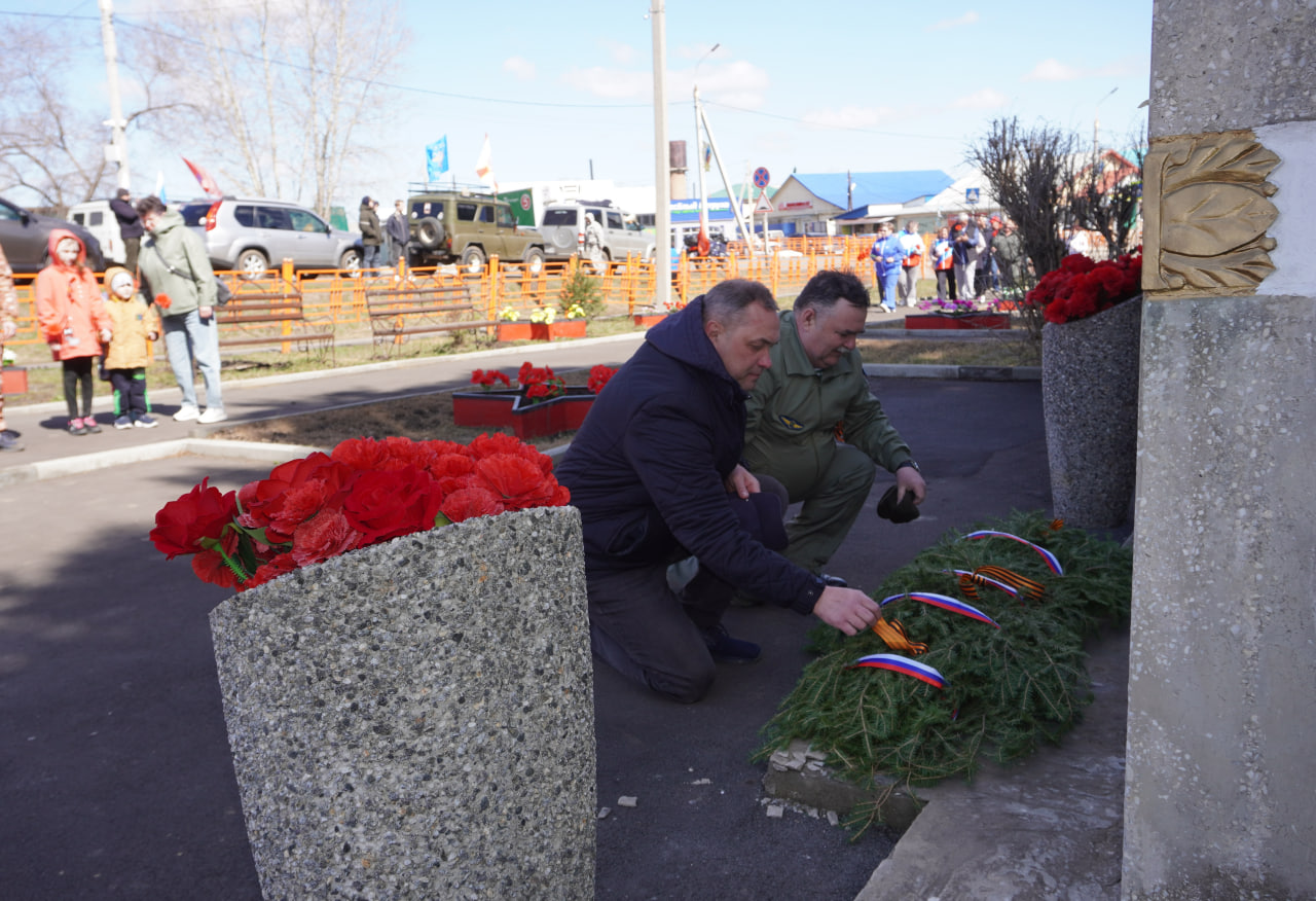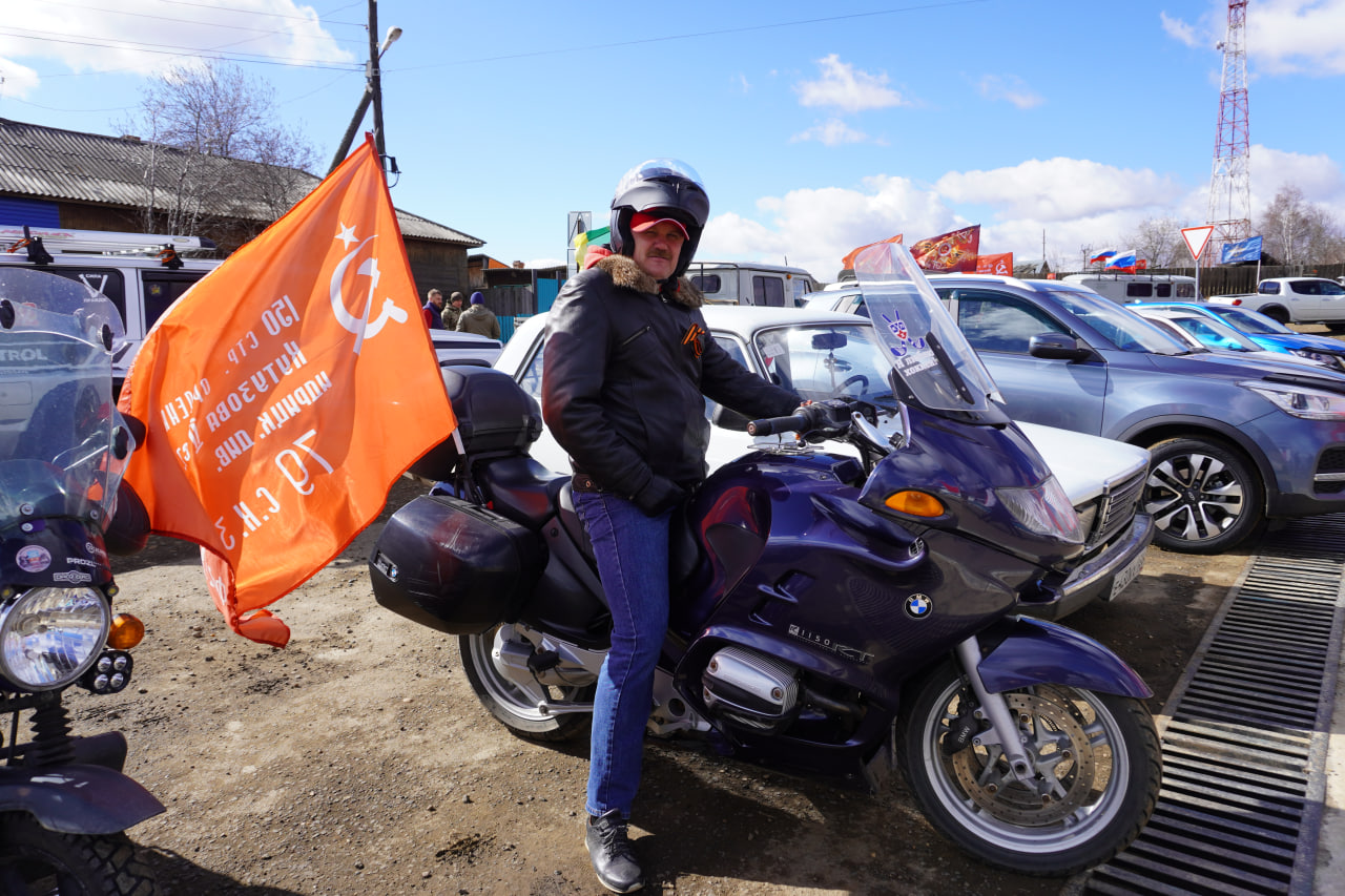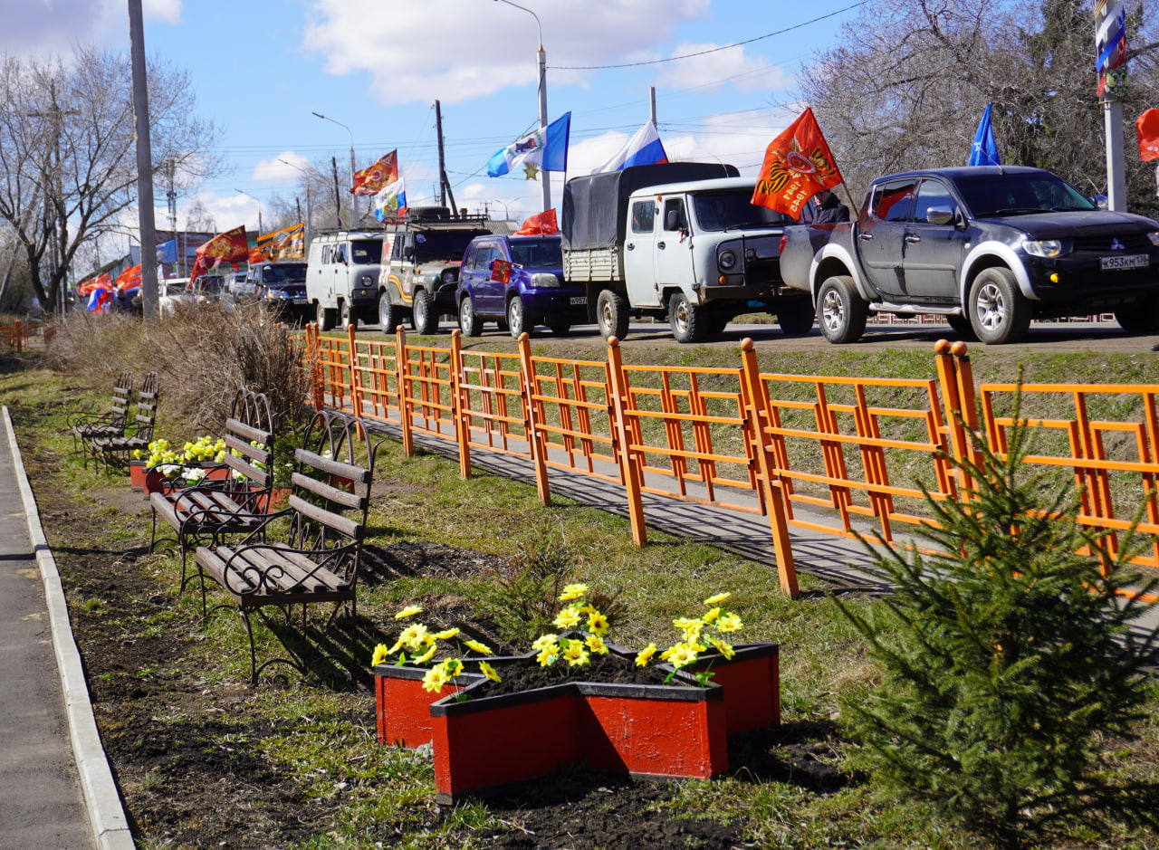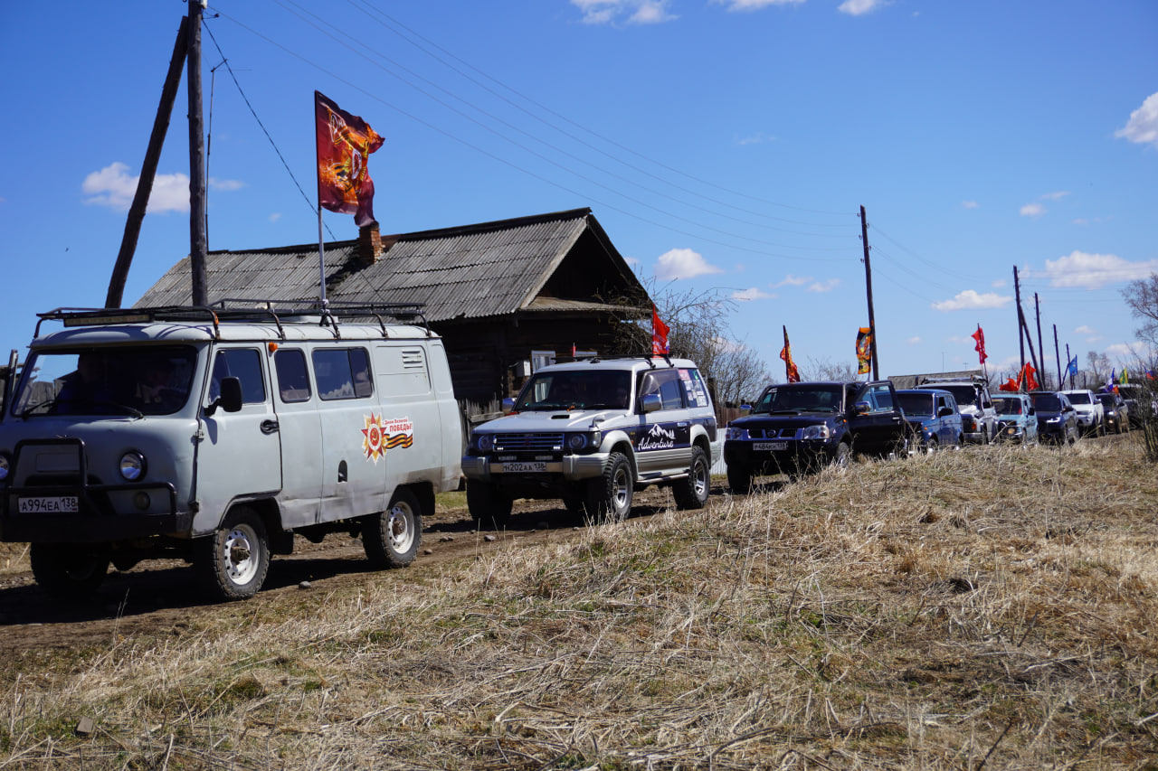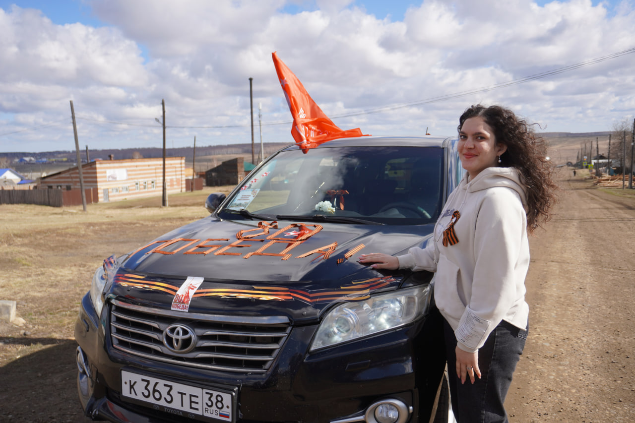 Колонна автомобилей, украшенная флагами и праздничной символикой, с музыкальным сопровождением отправилась в путь от «Социально-культурного центра Кадинский». Первая остановка была сделана в р.п. Куйтун у памятника погибшим землякам, где участники автопробега почтили память героев и возложили цветы.