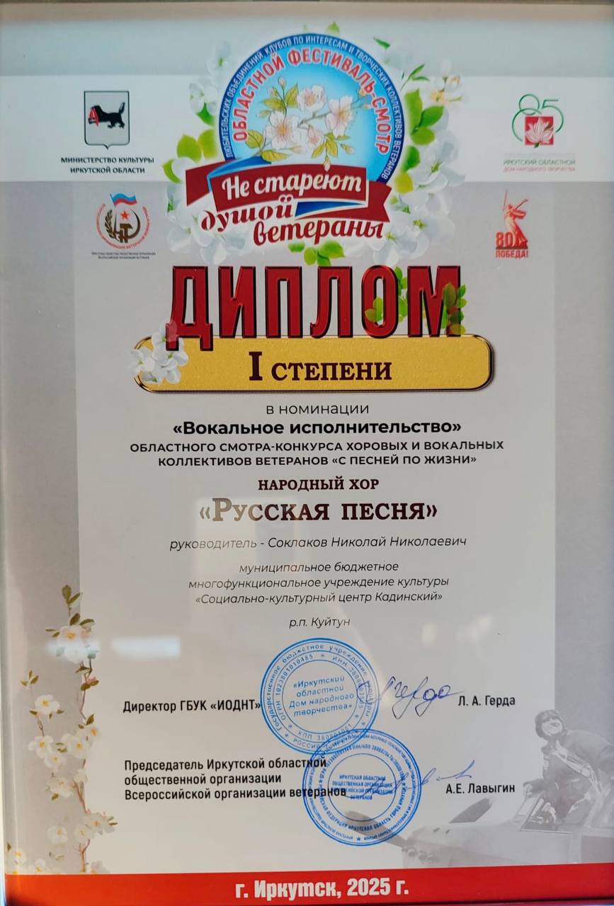 28 апреля на главной сцене Иркутского драматического театра имени Н. П. Охлопкова состоялся Областной гала-концерт победителей фестиваля «Не стареют душой ветераны», посвящённый 80-летию Победы в Великой Отечественной войне. В числе участников этого торжественного мероприятия выступил народный хор «Русская песня» «СКЦ Кадинский».