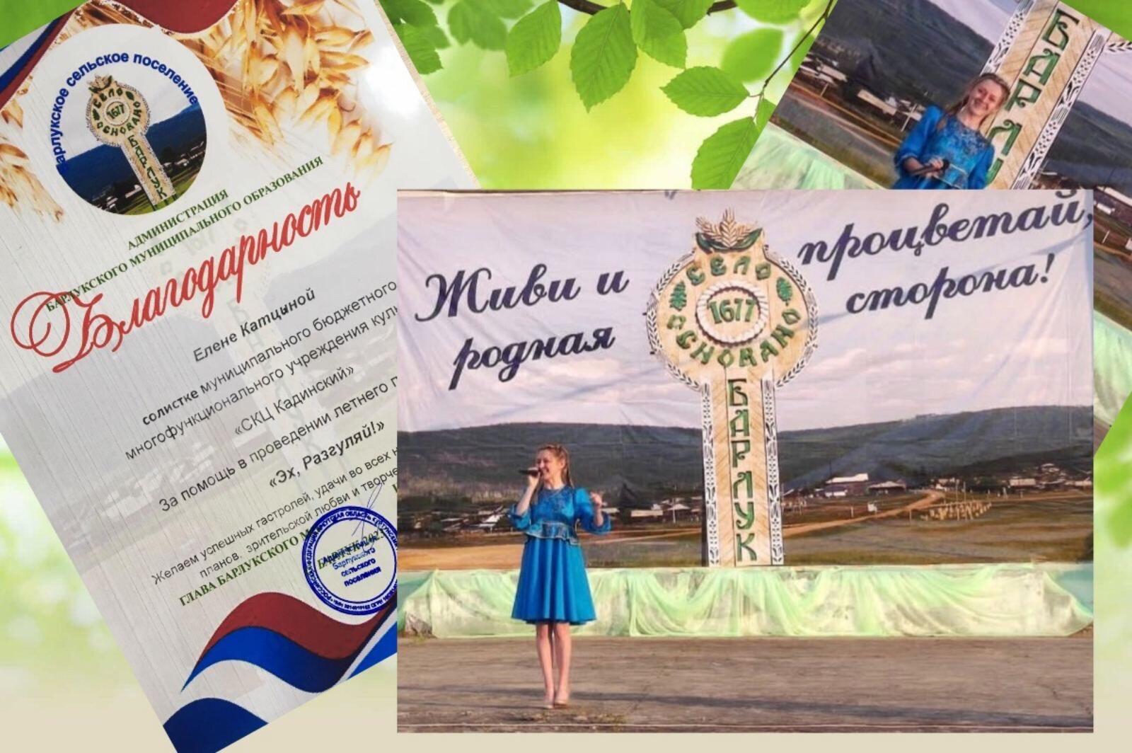 13 августа в селе Барлук прошли народные гуляния "ЭХ, РАЗГУЛЯЙ". В летней концертной программе приняла участие солистка "Социально-культурного центра Кадинский" Елена Катцына. Елена, которая является уроженкой этого села, исполнила песню для жителей "Живы будем-не помрем!".