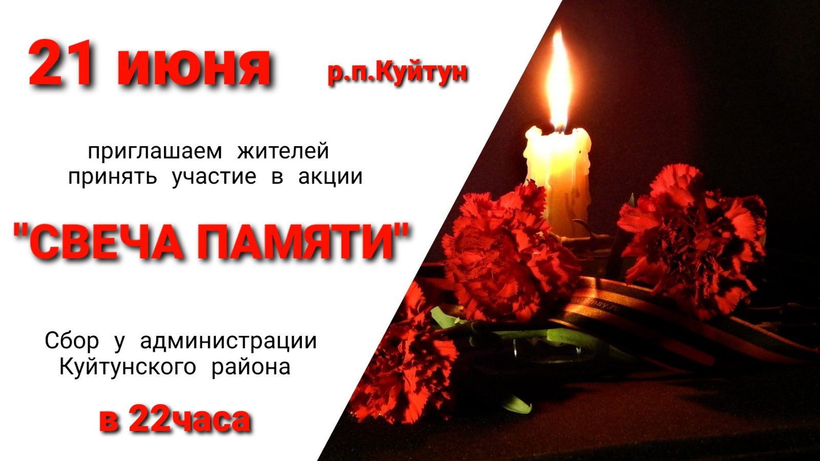 Приглашаем жителей р.п.Куйтун принять участие в акции "СВЕЧА ПАМЯТИ", которая состоится 21 июня. Мероприятие приурочено ко Дню памяти и скорби.